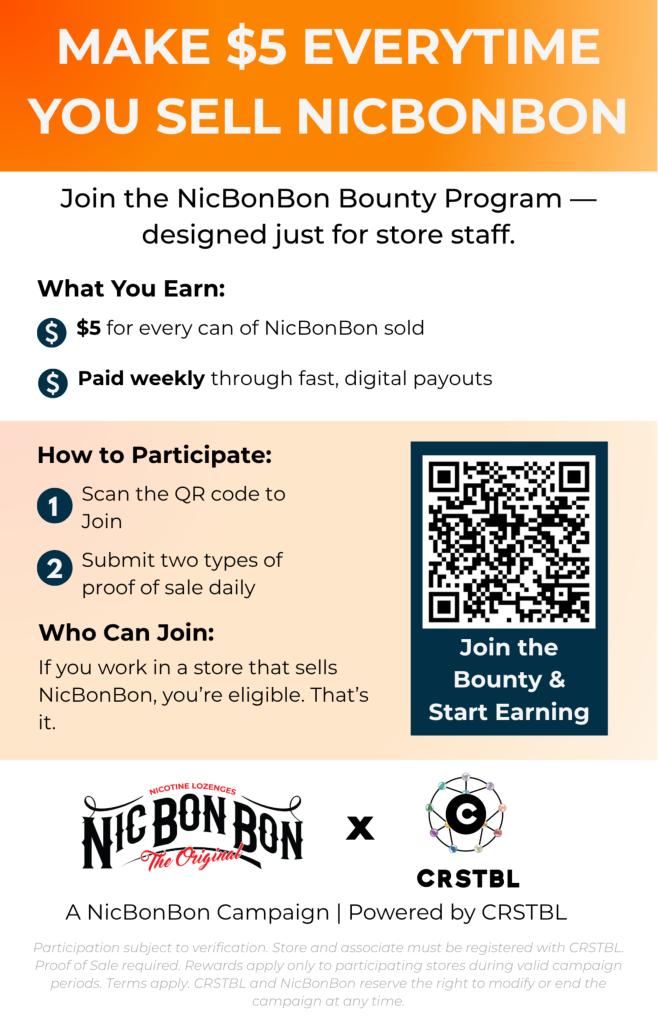For each can of NicBonBon you sell, CRSTBL will pay out $5 directly to you. The best part? There is no limit to how much you can earn.